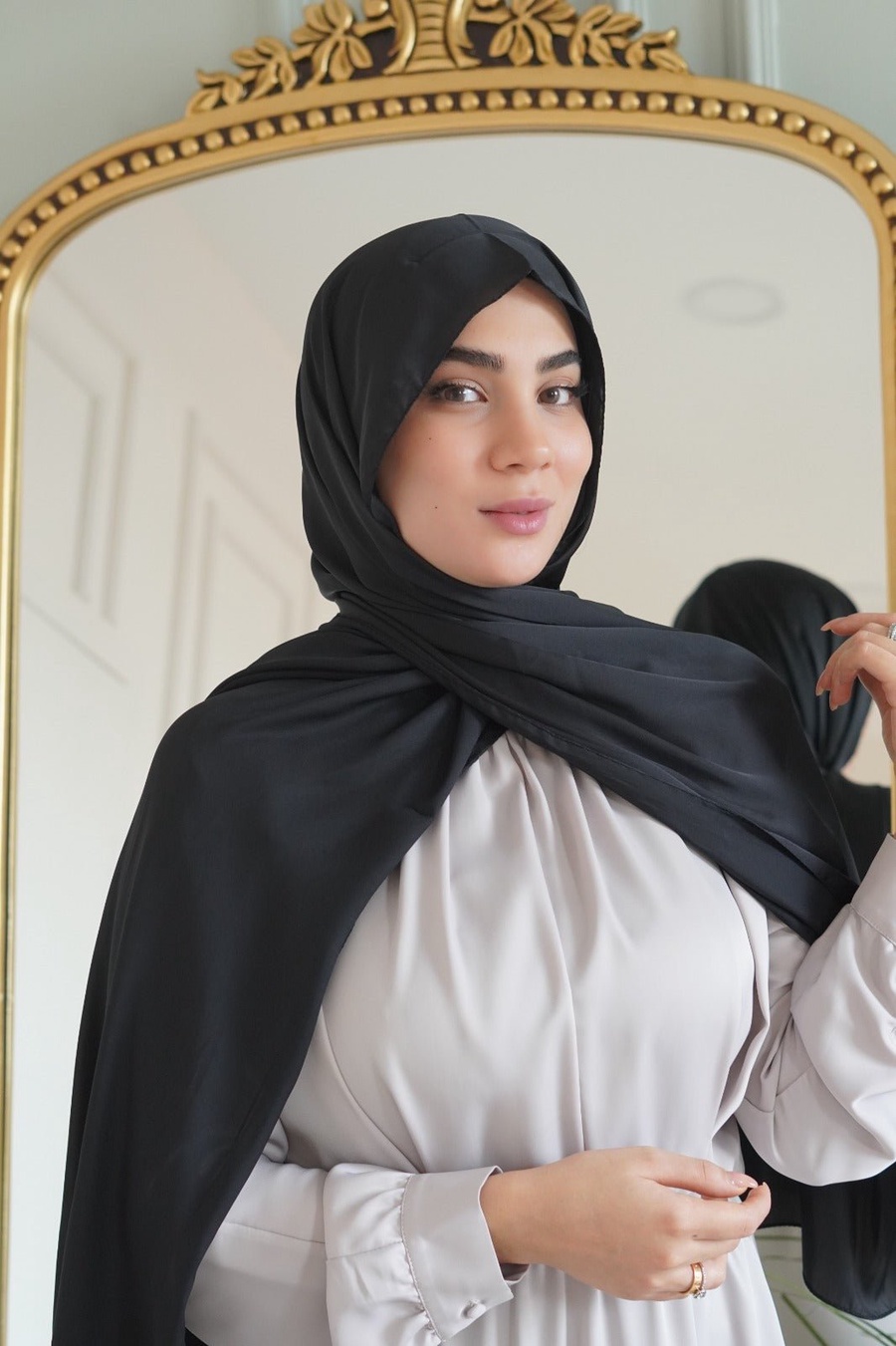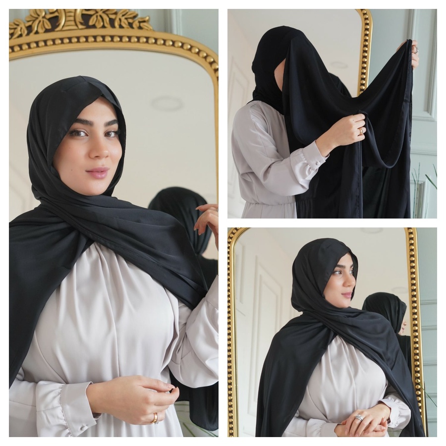 الأناقة بسهولة: استبدلي أوشحتك التقليدية بحجابنا الستان الفوري ذو التصميم المبتكر. استمتعي بيسر تغطيه الشعر و العنق واختبري هذه السهولة.، مصنوع من القطن المرن والستان. بعرض 70 سم وطول 180 سم، فقط خطوتين للأناقة البسيطة – لا دبابيس، لا كي، ولا طبقات إضافية
